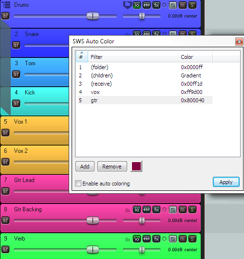 Themers, feel free to include 16 colors that work well with your themes in the ReaperTheme file. Add a section [SWS Colors] and values for custcolor1 through custcolor16 using the same format as the rest of the file. Save your current colors to the file first for a nice template.